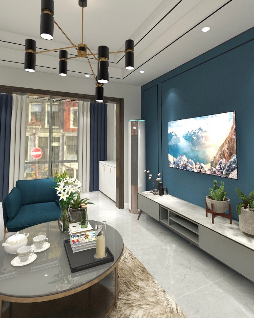 浅色墙面简洁大气,电视墙撞色体现了更好的视觉感