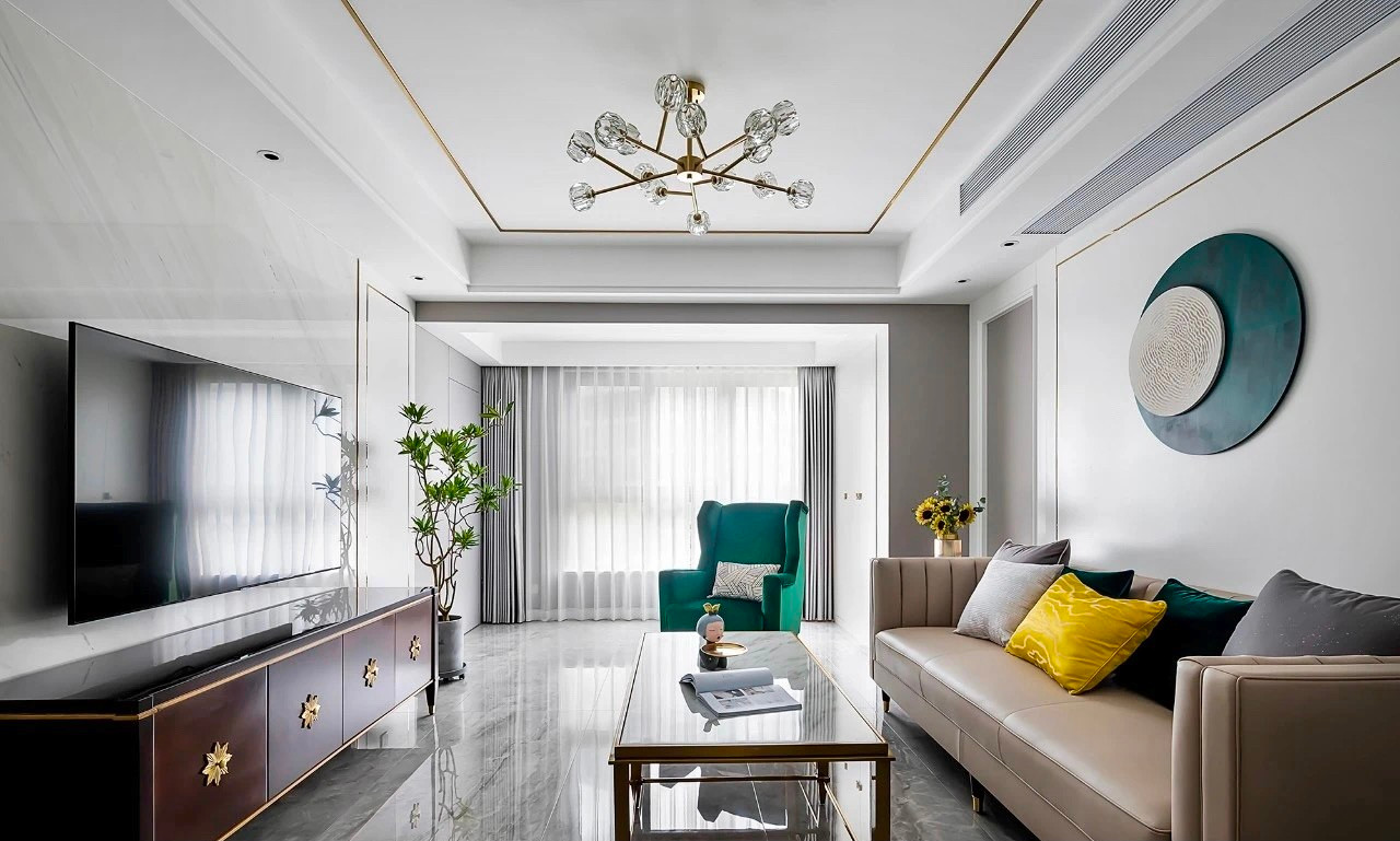 客厅纳入阳台,扩大使用面积与采光,地面通铺浅灰色的大理石纹砖,为整个空间笼罩上一层***质感