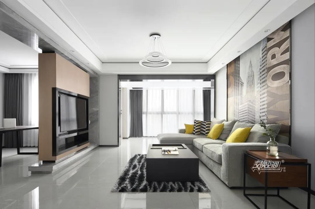 黑色的茶几,灰色的布艺沙发,黑白长毛地毯,几个亮丽的黄色抱枕,没有过多的家具软装,营造清新通透的气质。