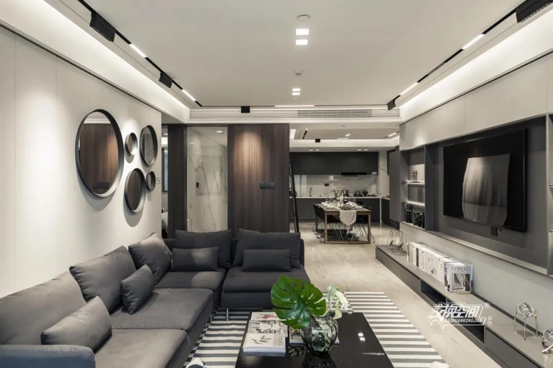 无主灯设计让整体空间显得非常通透,黑色的磁吸灯摩登时尚,设计简约而不简单。