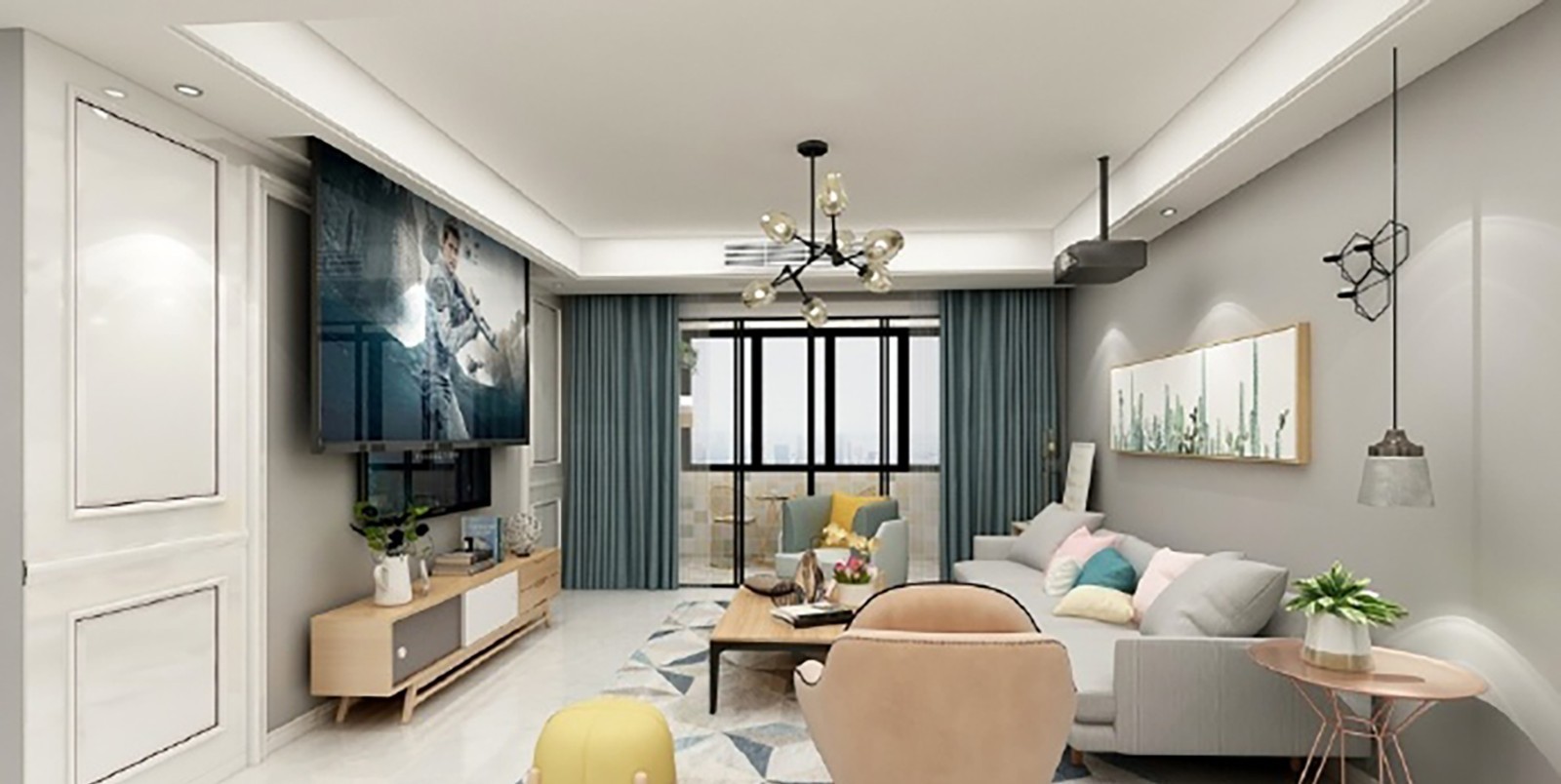 设计师将客厅对面的空间作为娱乐休闲的空间,软装搭配上加入许多亮色作为点缀,搭配整面灰色墙壁提高空间时尚感。