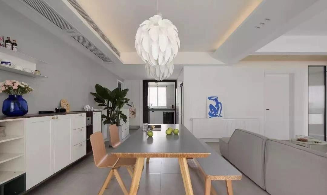 沙发背后的空间是宽敞的用餐空间,毫无阻隔的设计让视觉增加宽敞、通透,空间大而不空。