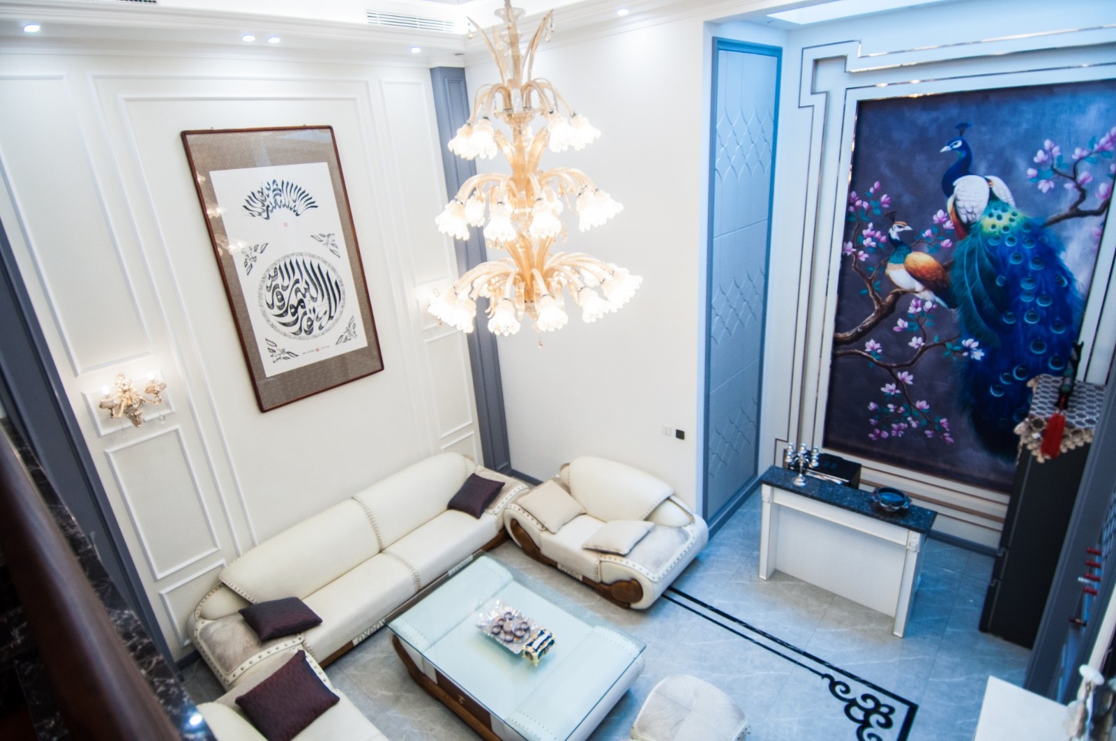 三层水晶吊灯以及大壁画很显档次