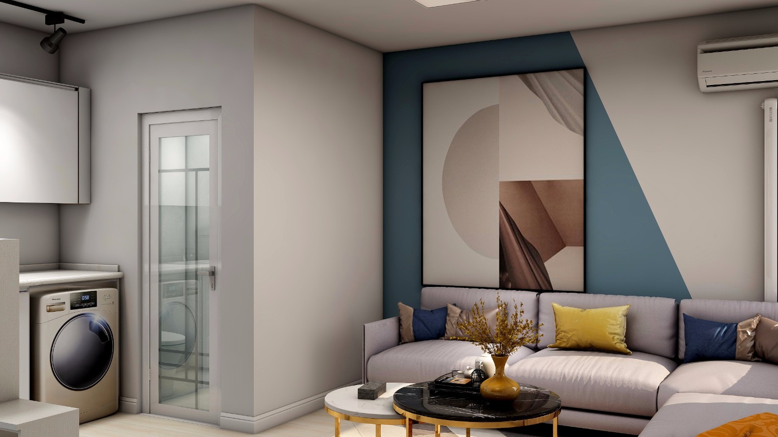 客厅光纤比较暗,整体采用亮色,背景墙跳色点缀。