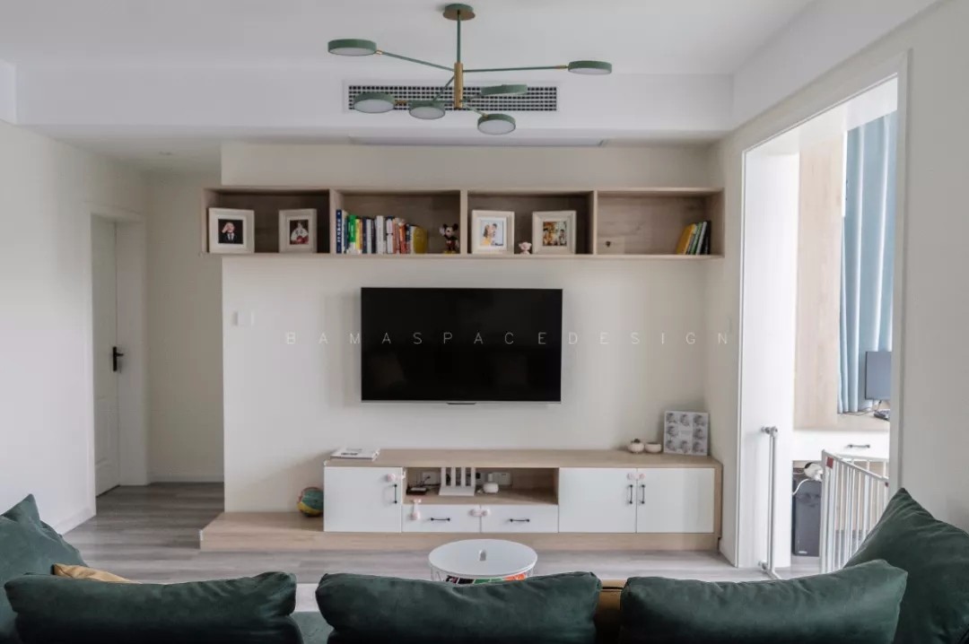 没有单独做电视墙,以全屋整体柜拼切成简约电视墙,既美观,同时也提高了实用性。让宝宝从小浸润在书香中,也许是为人父母的普遍期许吧~