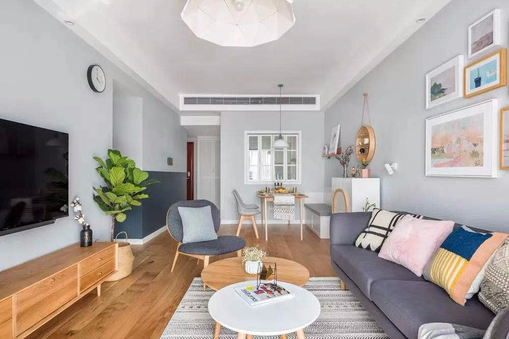 客餐厅是二合一的空间,背景墙以浅灰色为主,搭配温馨的木地板