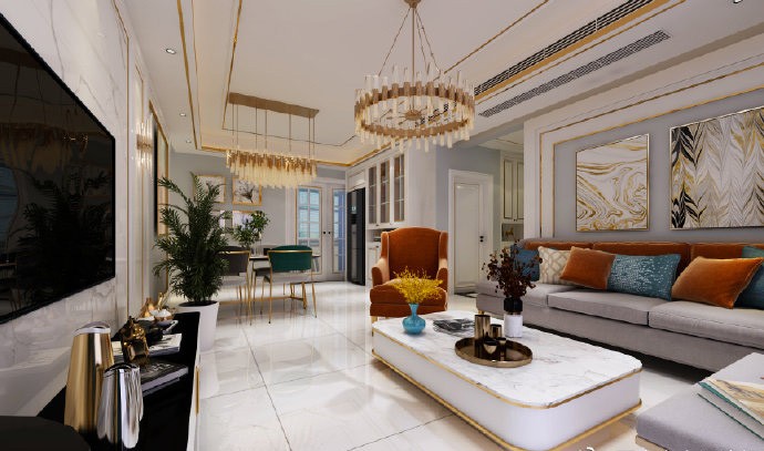 设计大理石背景墙,黑色抛光的电视柜和白色大理石茶几形成对比,灰色的沙发作为空间色彩的过渡色,金色的吊灯让客厅富有贵气。