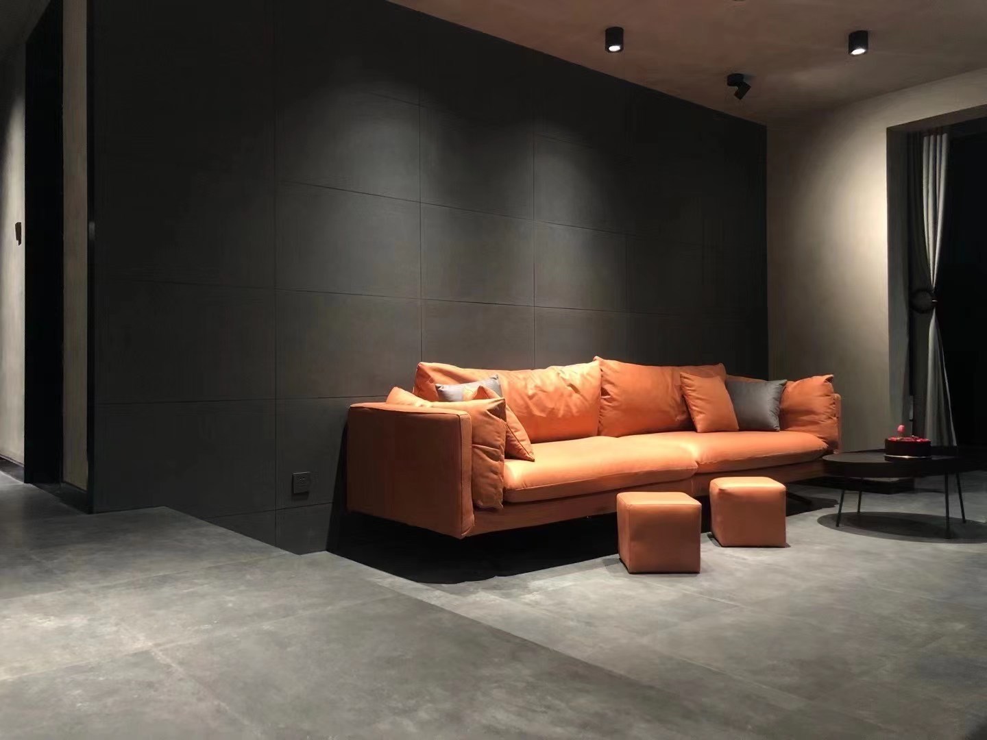 业主整体要求工业硬朗一点的感觉,背景用的深灰水泥板。无主灯设计