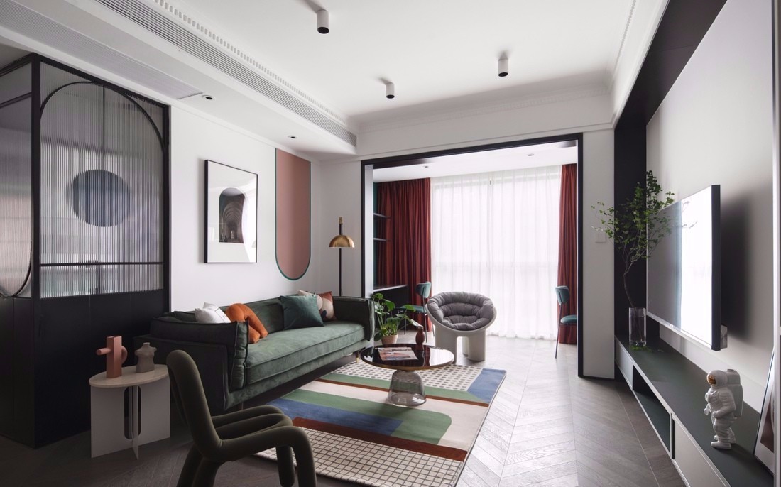 客厅空间以白色为主色调,融入墨绿、酒红、脏粉等低饱和度彩色,为空间增添了缤纷、动感的视觉效果