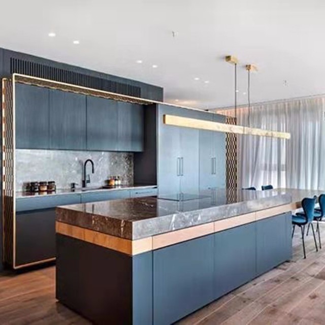 大理石台面覆盖在 中岛之上,与延伸出的 木质吧台长桌一起构成有趣的层叠效果 黄铜吊灯作为点缀 让料理区也显得格外优雅 橱柜四周装有穿孔 黄铜饰面板,中和了深色柜体的厚重感