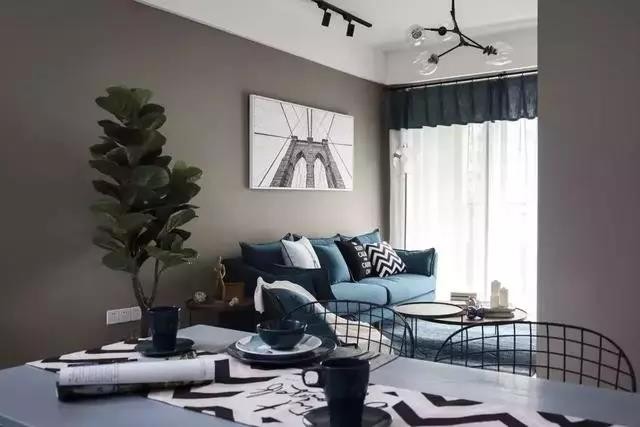 沙发与地毯选择了灰蓝色,和咖色的背景墙结合,更显***感。客厅和阳台之间做了推拉门加上纱帘的设计,满足透光的需求,又能避免看到晾晒的衣服。