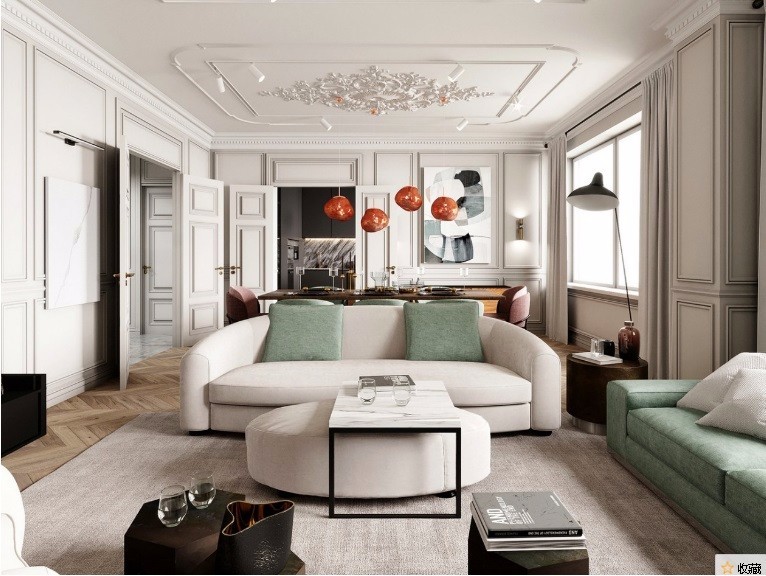 欧式的线条,让空间看起来很有层次感,简易的白色沙发,让空间看起来非常的舒适