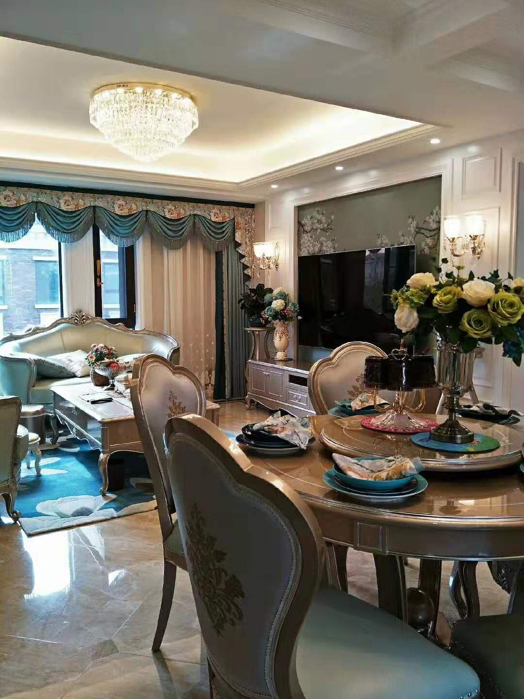 餐厅就在客厅旁边,动线合理,同时借助客厅的落地窗,可以保证用餐时的充足光线。美式圆桌及桌子上的美式元素物品,会让用餐显得很高贵精致。