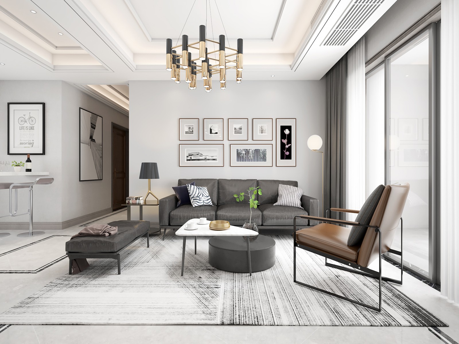 客厅作为活动的公共区域,减少小件家具的数量,保持了一个简洁的空间环境。客厅的色彩简单,黑与灰做为表现,给空间一种利落感觉。