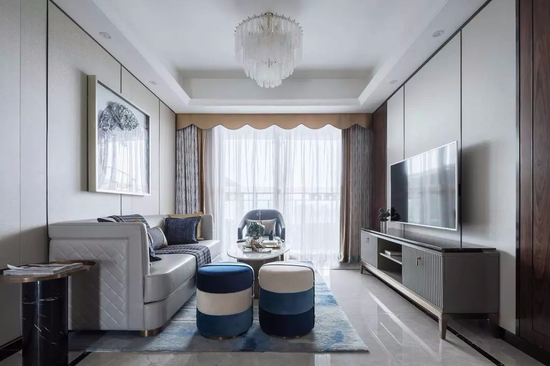 米白色调为主的客厅,地毯与小圆凳加入淡雅的蓝色调,电视墙与沙发墙都以硬包护墙板为背景,整体现代温馨又雅静的布置,给人以轻松舒适的浪漫氛围感。