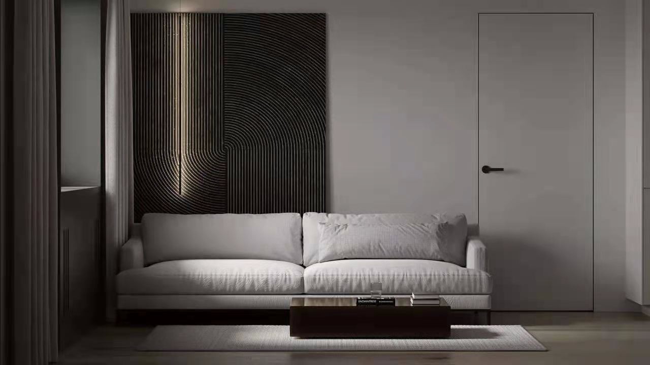 客厅整体显明亮色调,白色沙发背后的黑色螺纹装饰面板,再白墙烘托下更为显眼。