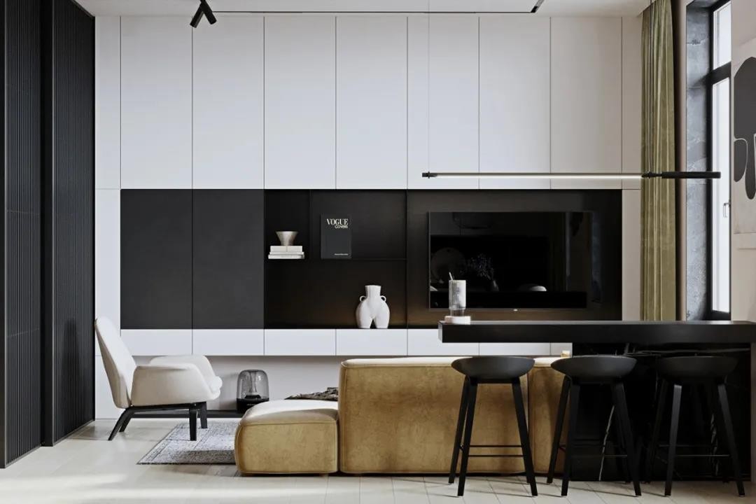 黑色格栅后就是客厅空间,电视背景墙是一整面的壁柜,白色的壁柜在电视高度位置变成黑色,两者巧妙融合使空间层次丰富。
