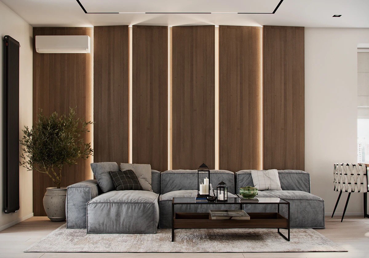 质朴温暖的实木背景搭配浅灰软沙发。