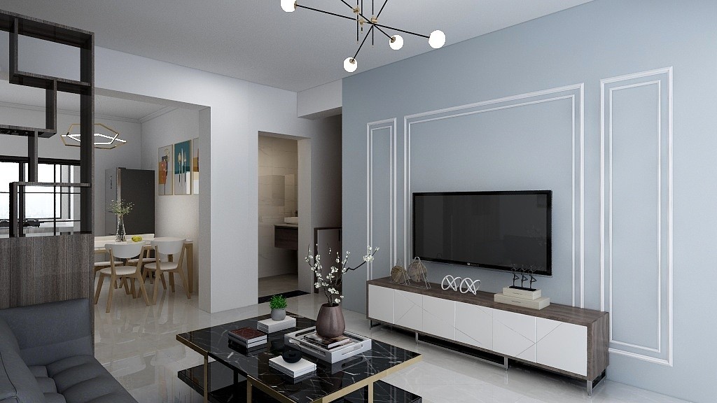 镂空屏风是屏风与现代化设计相融合的产物,起到分隔、美化、协调等作用。蓝色电视背景墙装饰出客厅的大方优雅。