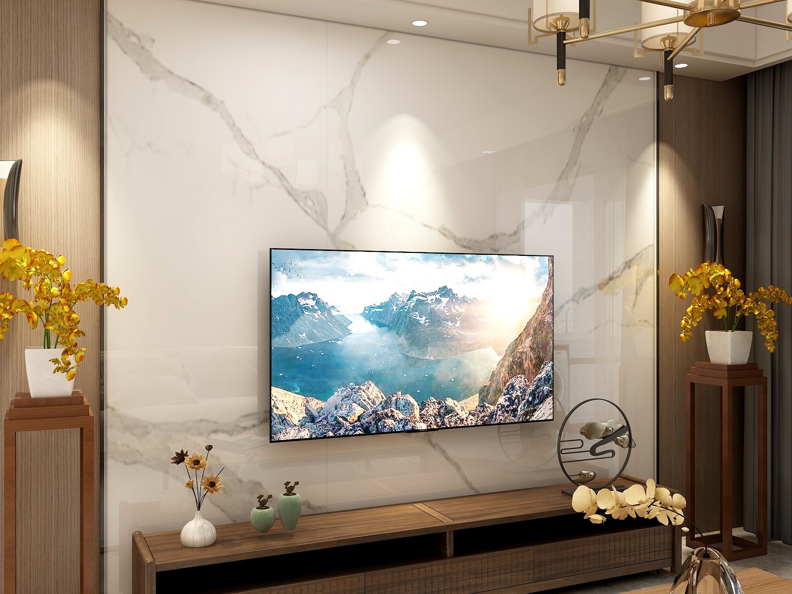 背景墙是砖上墙设计,做了中轴对称的处理,符合新中式设计的灵魂元素,不仅让空间在视觉上宽敞,搭配上木质家具,使整个空间的居家质感上升很多