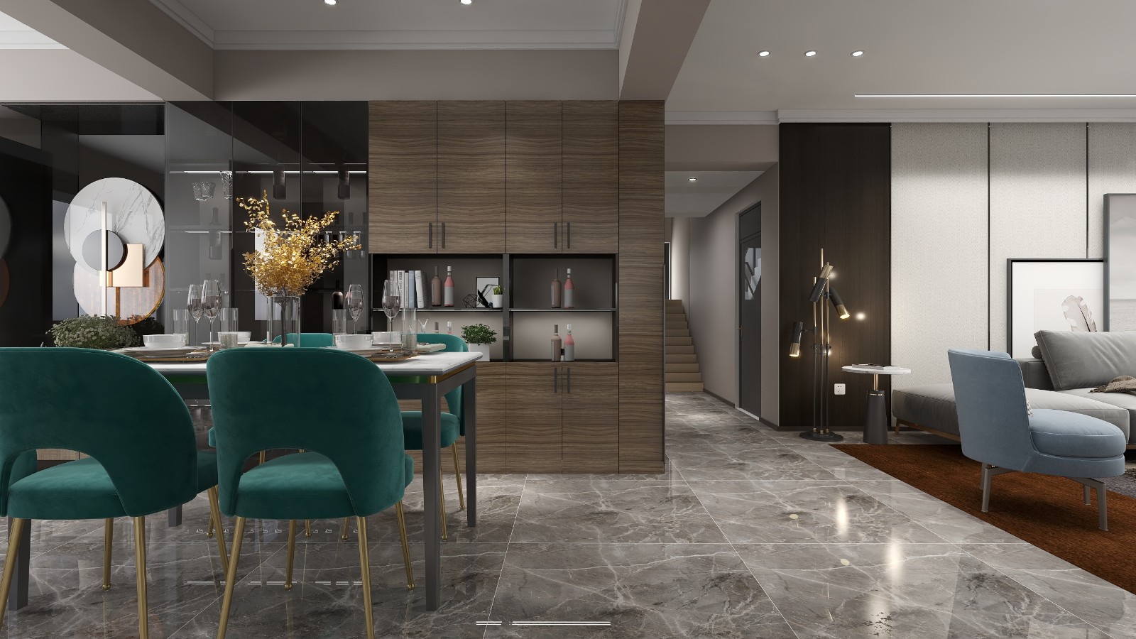 港式轻奢风,以深咖色及灰色为主色调,局部点缀米白色及撞色