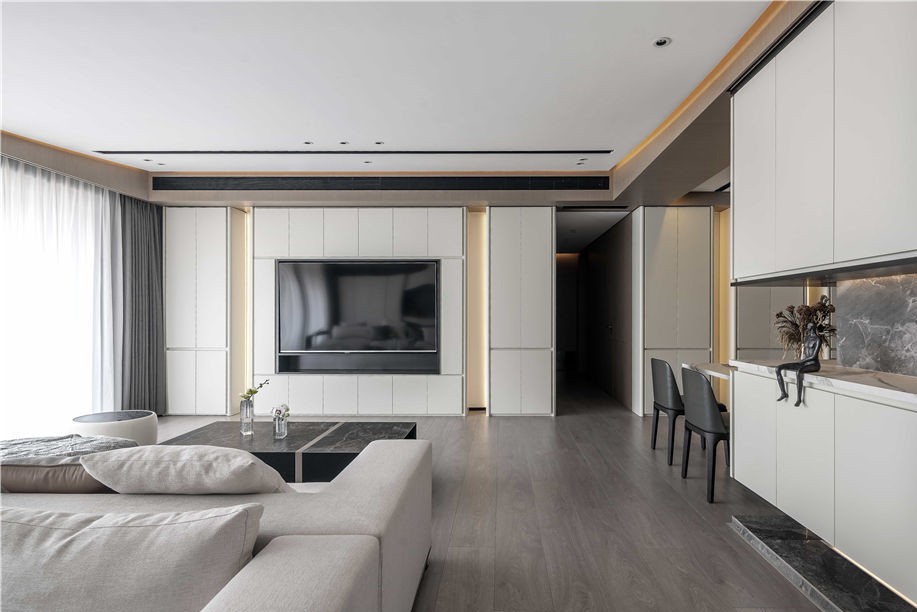 客厅主色调是白灰色,电视墙的设计内凹了两条光,削减了体量,使风口与背景墙的结构更平衡,空间的留白是至关重要的,未来可以有更多的可能性。