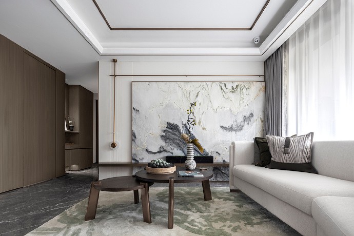 客厅的整体气质呈现出清雅而简净的意味,大理石背景墙光滑的质地、无序的纹路肌理,与柔软的布艺沙发在对比间凸显出空间气场的融合。