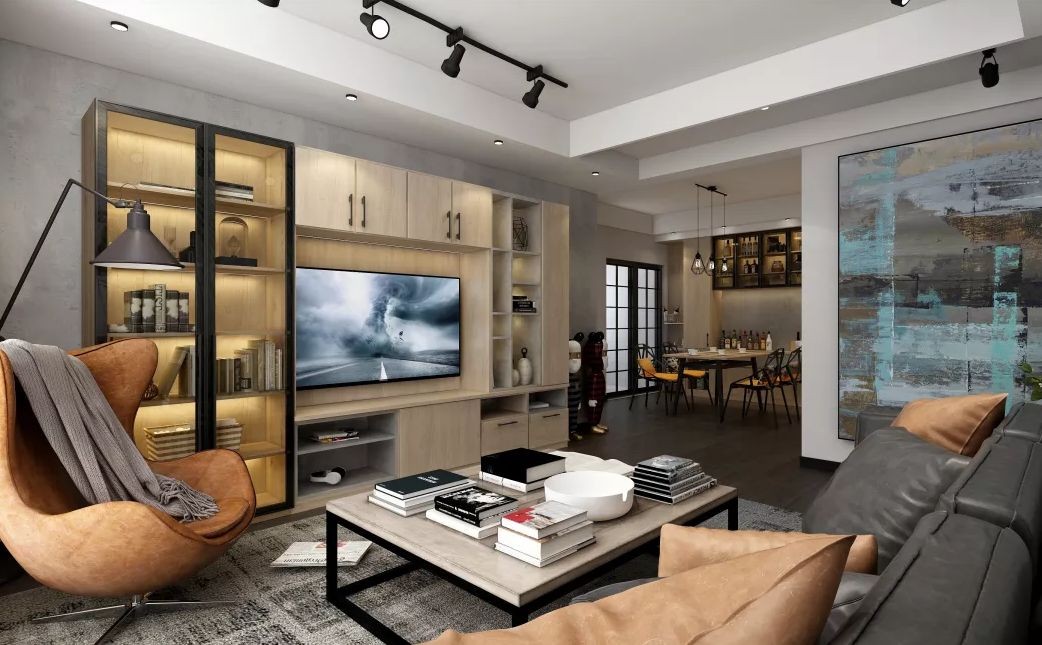 吊顶风格略显粗狂,但定制电视柜粗中有细,玻璃酒柜突显品味。