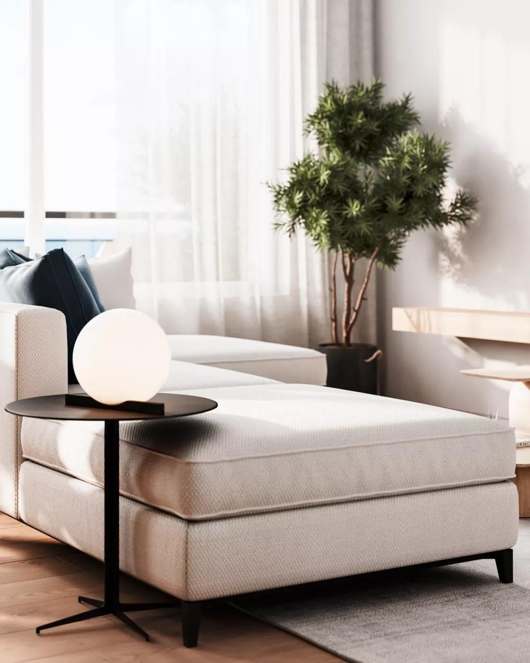 客厅主色调采用大面积的白色,地板则选用了浅色系的原木,让整体空间看起来舒心且柔和。L型的沙发和太妃椅可以让人彻底放松下来。