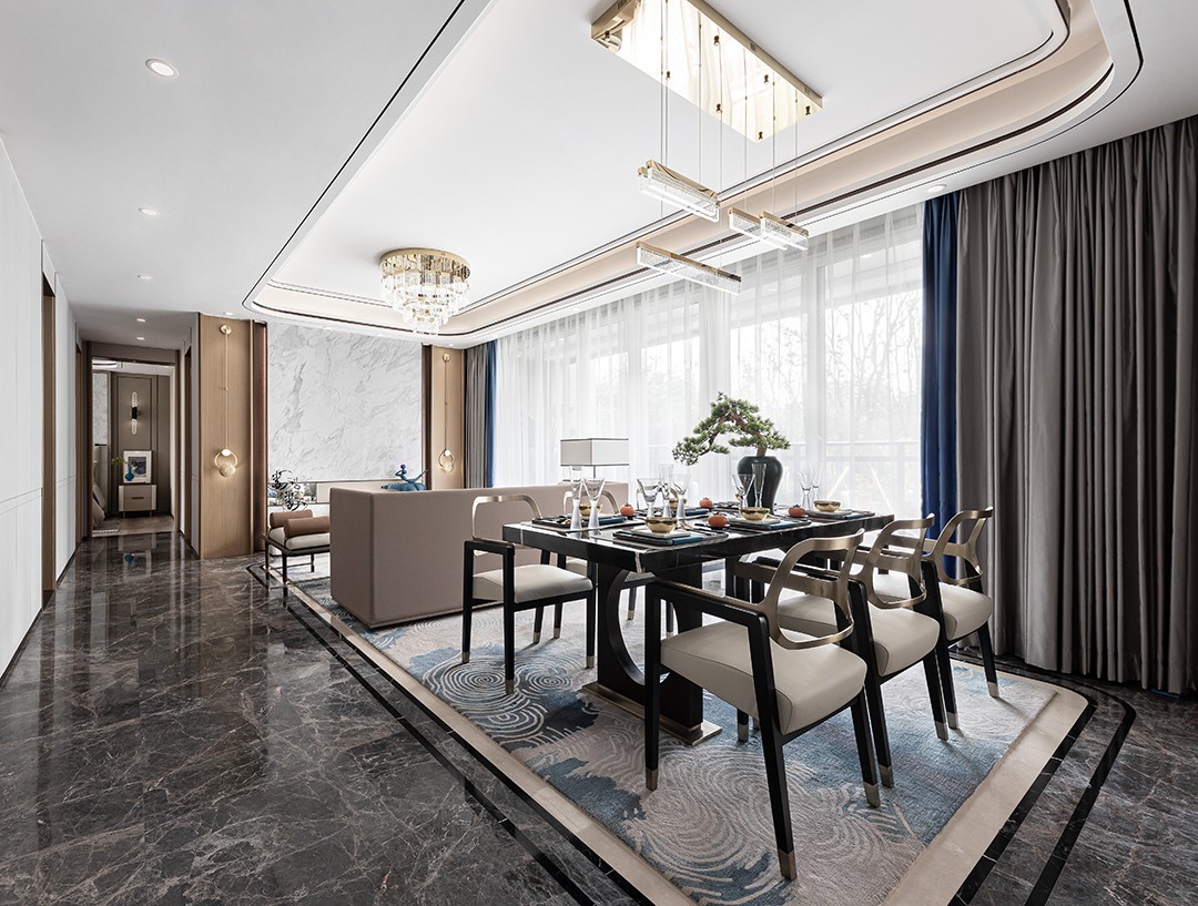 富有自然肌理感和温润质感的大理石,搭配简约素雅的艺术地毯,融入现代时尚的家具和复古感的艺术饰品,勾勒出空间低调优雅而不失温馨的***气质。