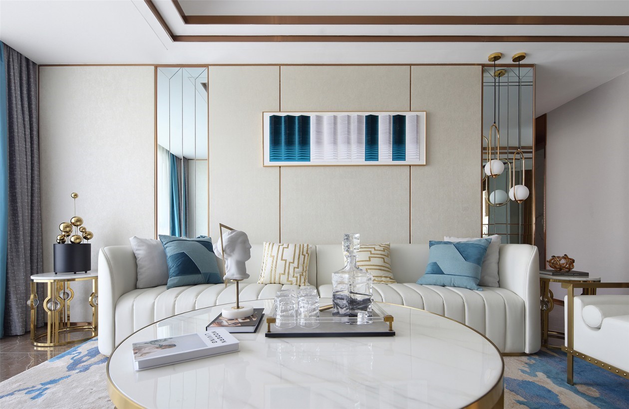 客厅内,大面积的白色作为空间的基础色调,星星点点的蓝色点缀在沙发、窗帘与装饰画中,蓝与白的融合交汇使得整个空间优雅轻快。推门入室,仿佛迎面吹来一阵清爽的海风,让人褪去疲惫,心旷神怡。