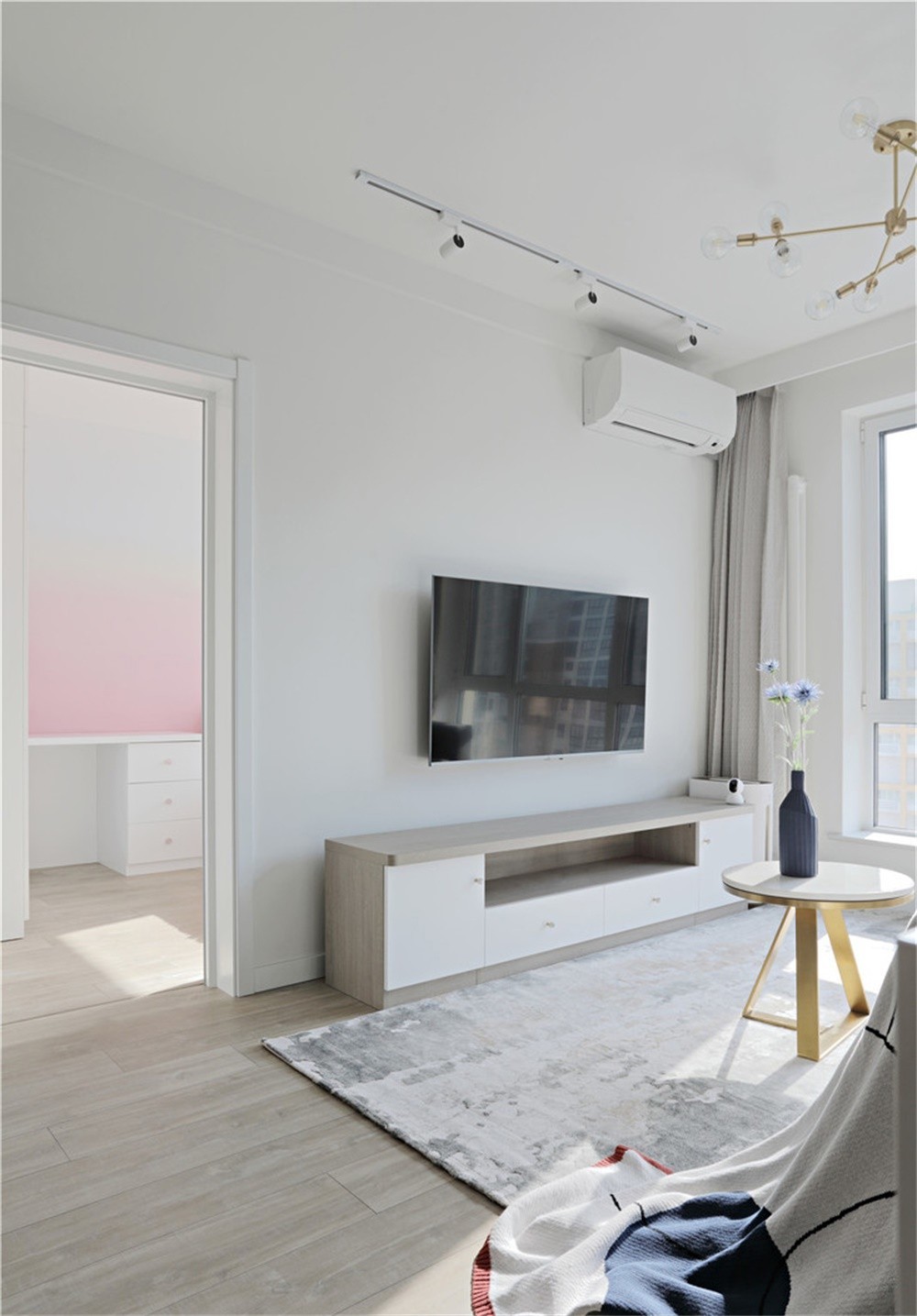 客厅的中间是一个圆形小茶几,简洁而又时尚,上面摆放花瓶尽显浪漫的生活气息。 金色的异形树枝灯、茶几的黄铜金属色和低柜下露出桌腿的金色,恰是整个客厅的点睛之笔,让空间更显得轻奢高雅。
