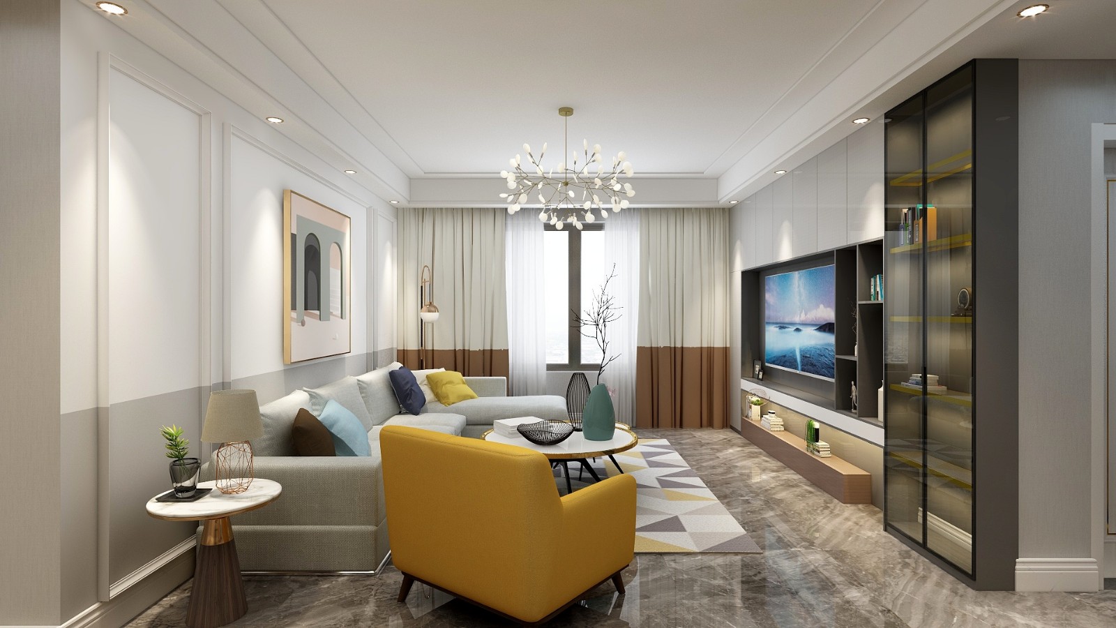 客厅电视背景墙做整体定制柜体,玻璃柜门内置感应灯带。沙发背景墙做上下墙调色处理,辅以石膏线,风格清晰。