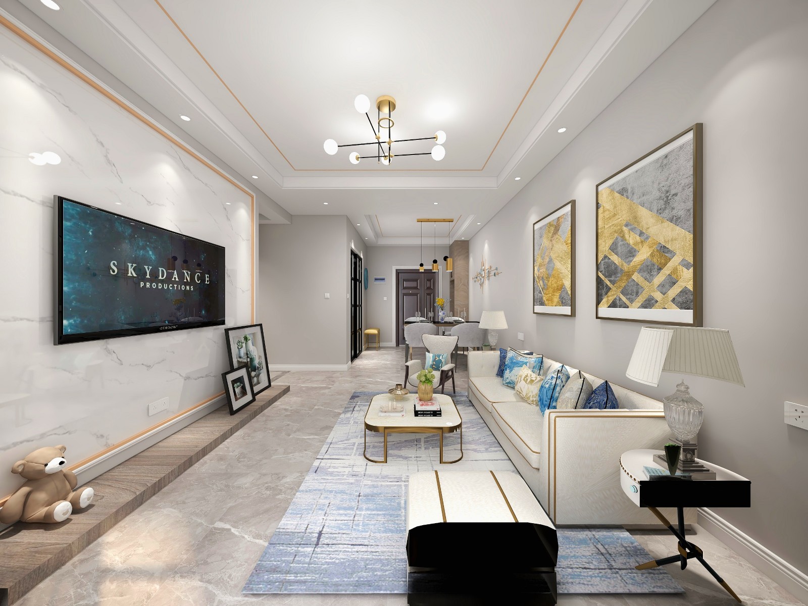 电视背景采用爵士白的砖上墙,加上玫瑰金金属线条,与顶面相结合,让简单的空间,质感更加好。