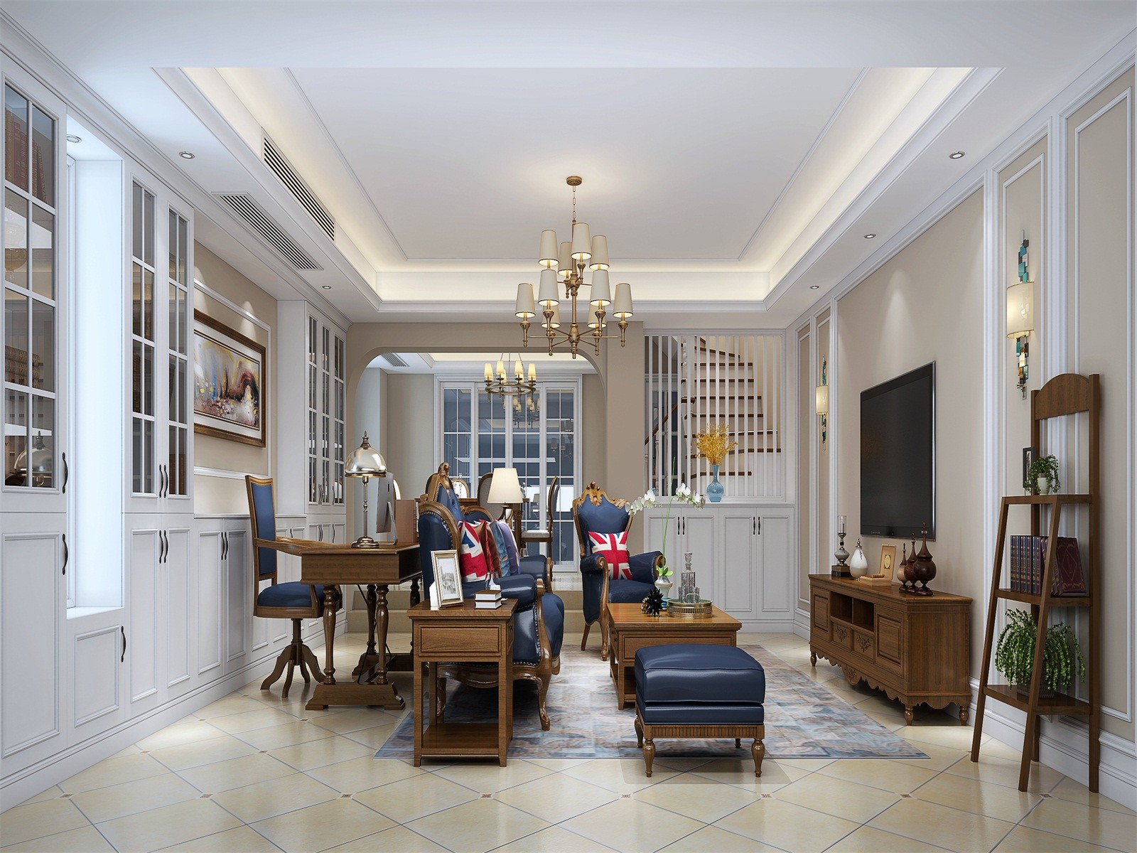 采用的小美式的仿古砖,以花片去点缀,让整个空间多了几分灵气,电视背景以现在较为流行的石膏线去修饰,既节约了成本,又起到了画龙点睛之作用,客厅是家庭氛围的关键点,客厅的开间较大,所以又划分了开放式书房的区域,在一定程度上达到了空间的饱和感.