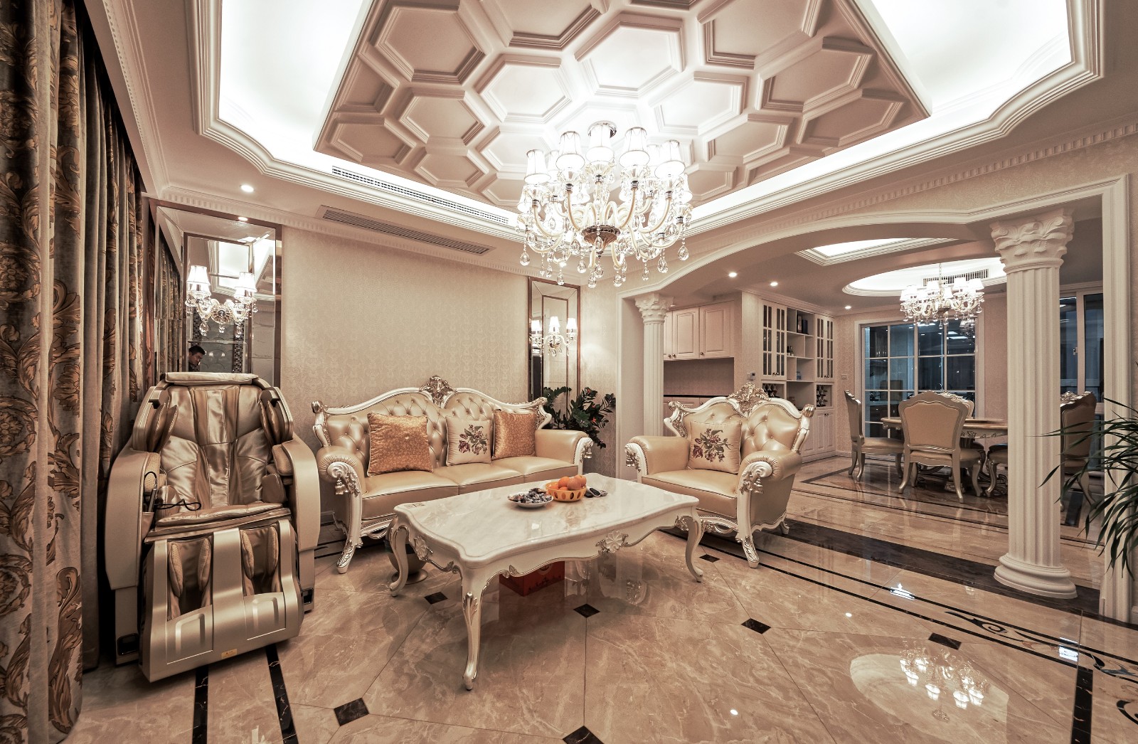 客厅欧式新古典奢华罗马柱与顶面欧式拼花吊顶相融合,让整个客厅欧式元素更加大气.