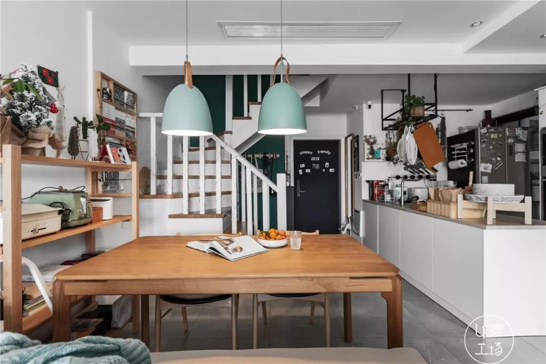 楼梯扶手上的LED小彩灯、墙壁上的简约置物架、整面的墨绿色墙壁……让这个小小的楼梯间,也不断流露出屋主极具活力与温暖的生活态度。