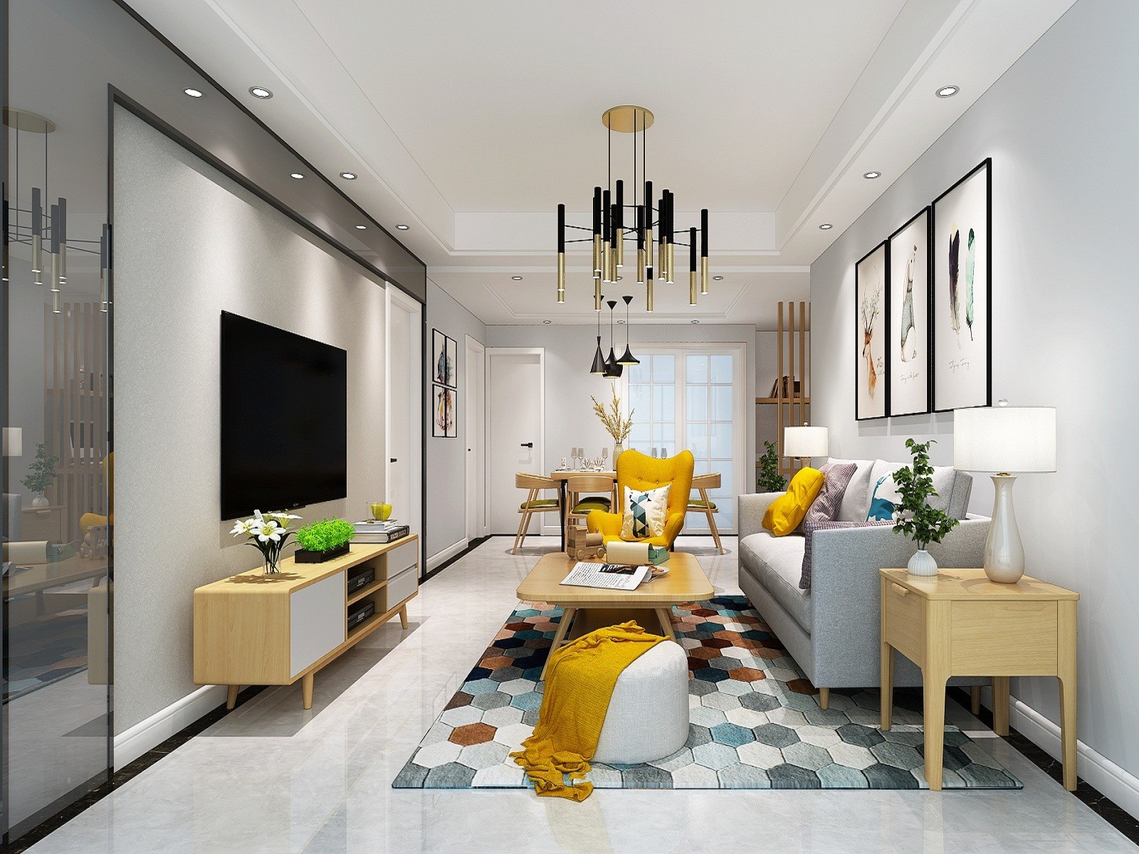 该户型客厅较大,整体灰色主调,搭配亮色软装装饰,别具一格。