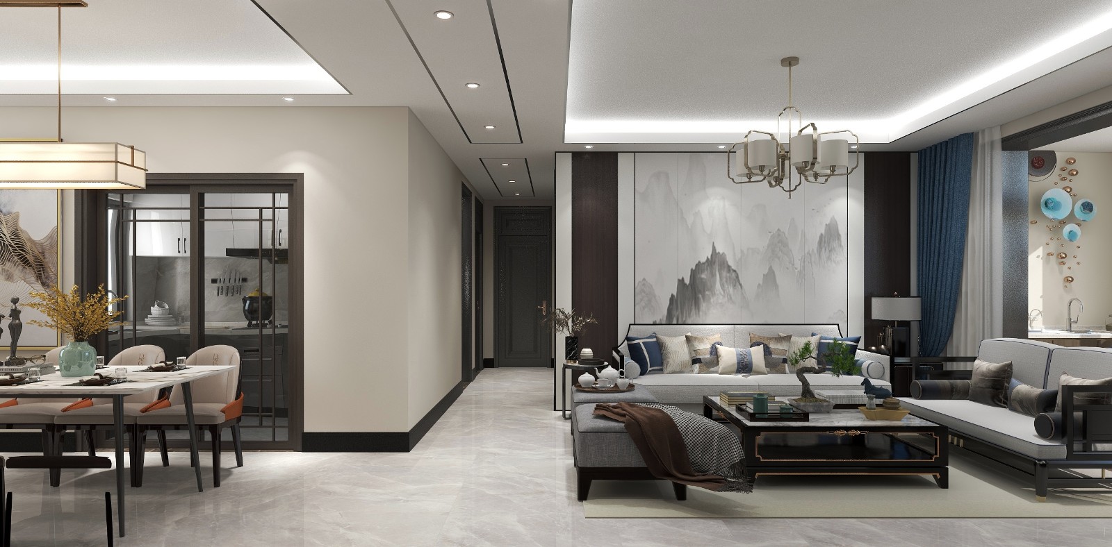 整体采用米白色墙布,局部用深色点缀,增加房屋的文化底蕴