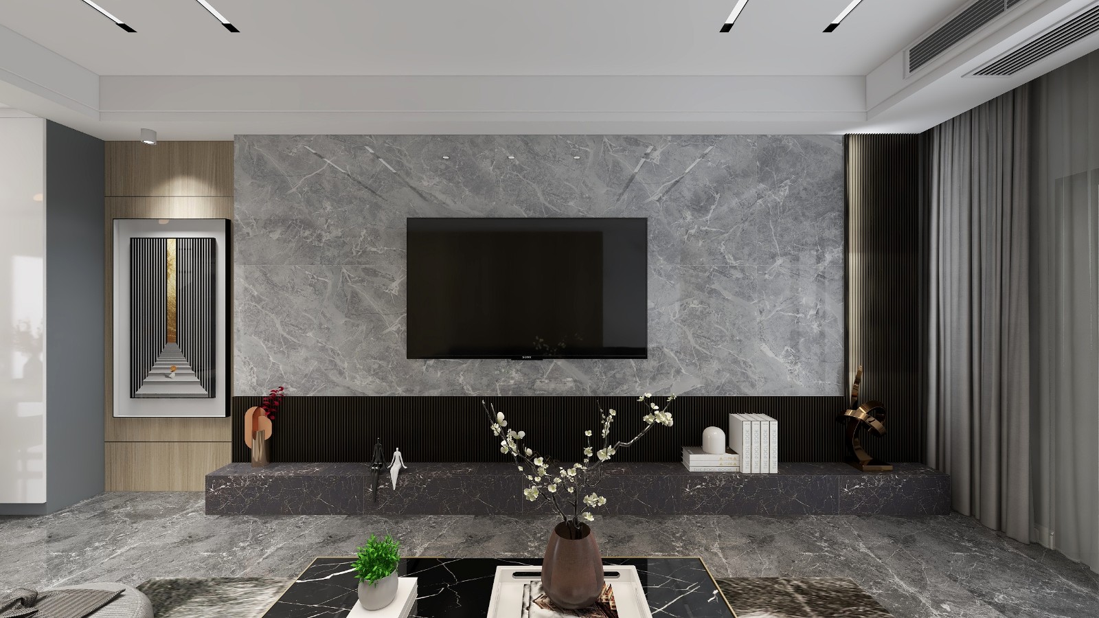 无主灯顶面,大理石干挂,木格栅衬托电视背景