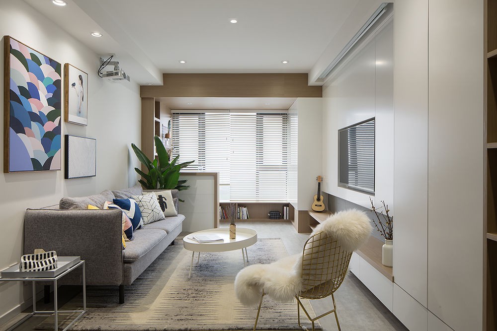 阳台区域划分到室内,给客厅的空间做了加法,阳台的顶面和地面通过木饰面连接起来,也更好的和客餐厅呼应,这样在视觉上扩大了整个客餐厅的空间感。