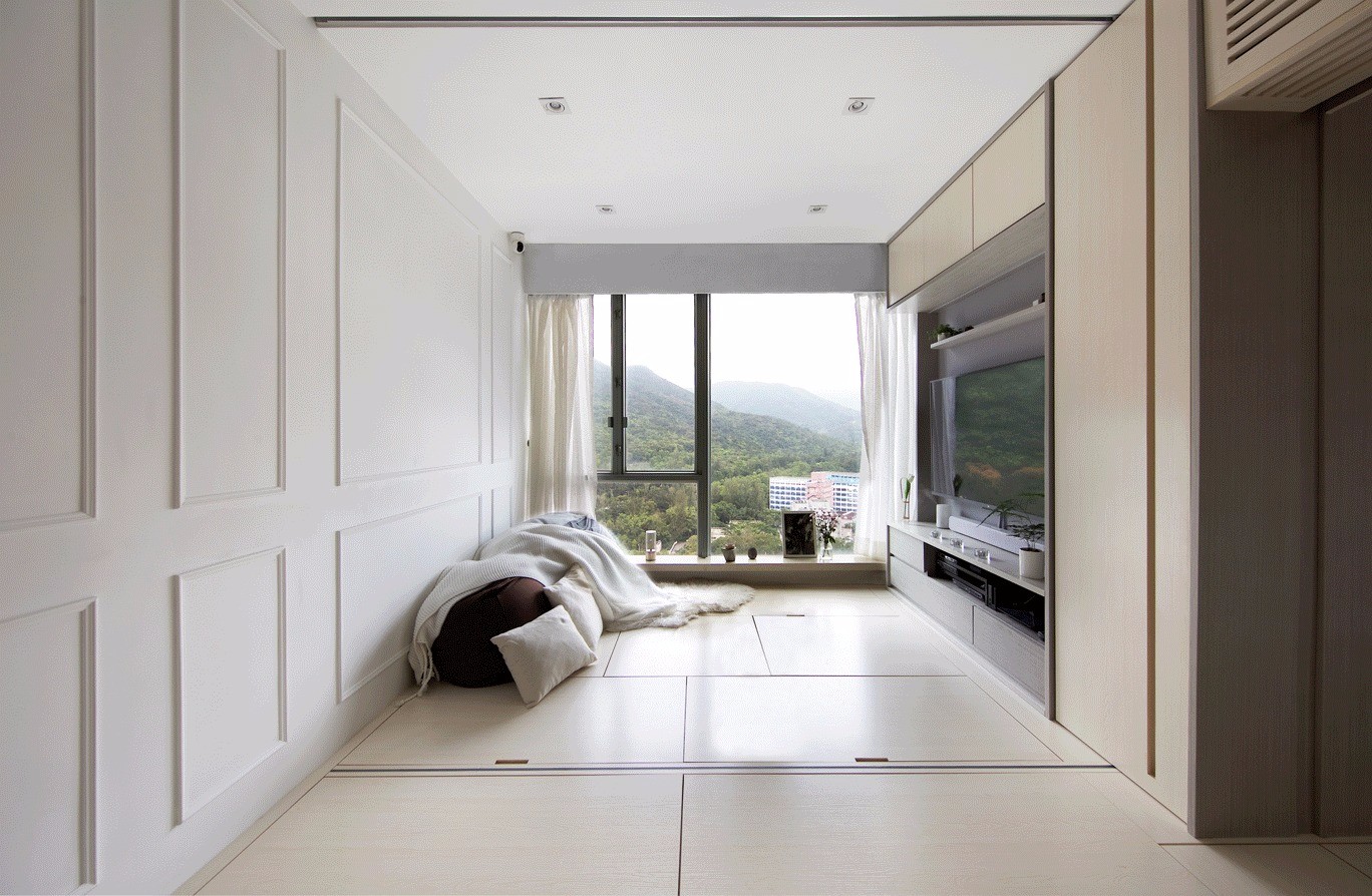 地台除可作大量收纳外,亦暗藏智能升降茶几创造具温度的聚点,时而进行茶道