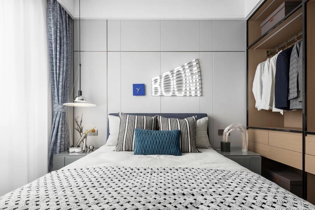 一幅夸张画像,将房间元素色彩散发而出,让人在视觉上产生深刻记忆,深蓝色打造海底世界,遨游在深海之中。