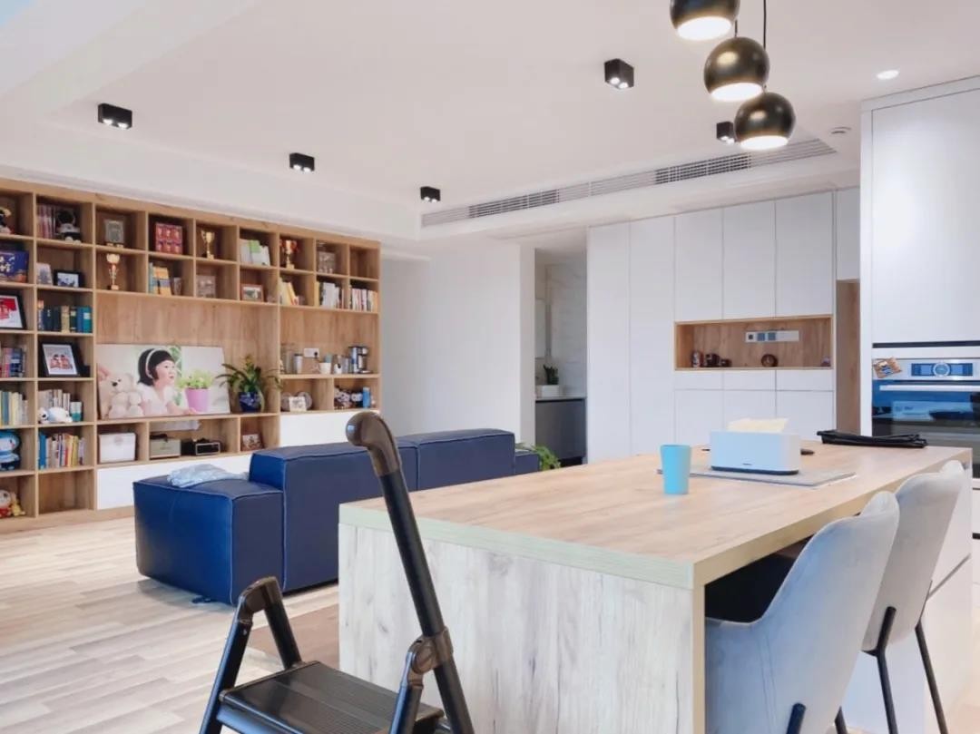 该户型动线流畅,动静区域划分比较明显,卧室都靠后,接待和活动区域都靠前。业主常住人口是一家三口和一个老人,男业主是做餐饮的,所以对厨房使用要求高,家里一般不来客人所以不需要考虑客房。 较大的改动是将4房改成了3房,将2个次卧打通,做成了孩子的起居及学习一体的套房设计。同时考虑到孩子的同学来临时居住,所以2个房间之间用推拉门隔开,需要时可以一分为二。 全屋采用了原木色地板与白色主色调。