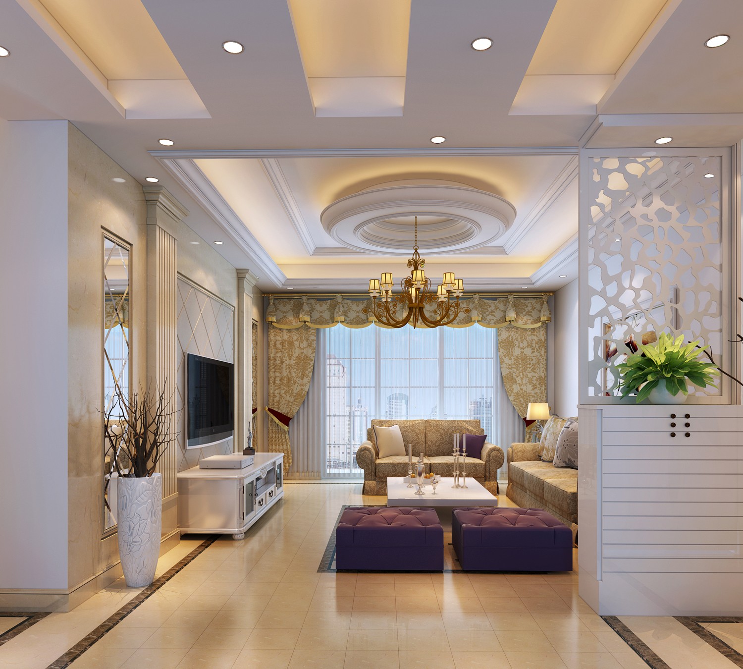 三层的吊顶,增加客厅的复杂性,欧式风格讲究对称,大理石面的背景墙体现了豪气