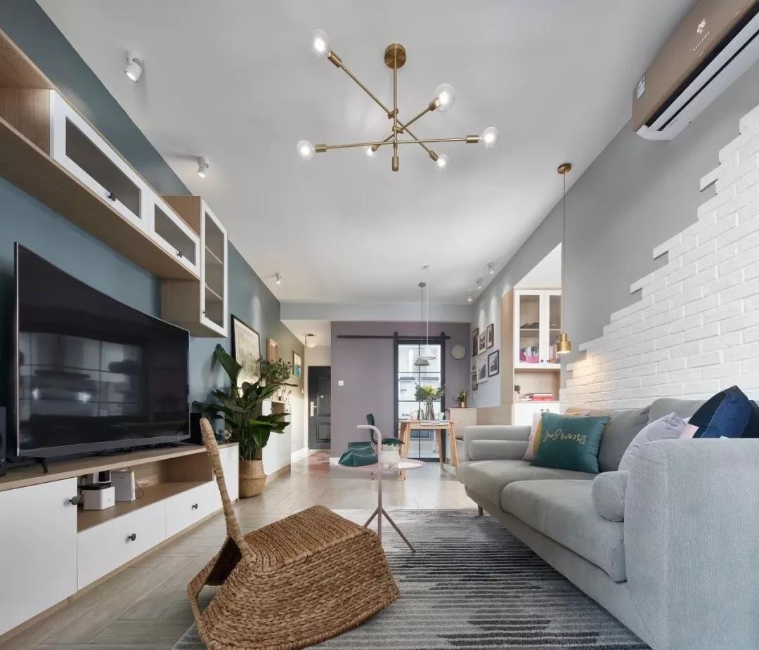厅的电视墙背景色与玄关的灰蓝色保持一致,电视柜旁边一盆绿植,结合白色的电视柜与吊柜,带来了一个清新文艺的视觉感
