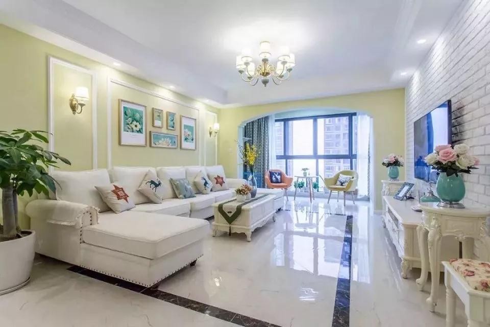 墙壁装修用浅黄色乳胶漆来装饰,电视背景墙用简单的文化砖,有年轻人的小清新感同时又不缺温馨浪漫。