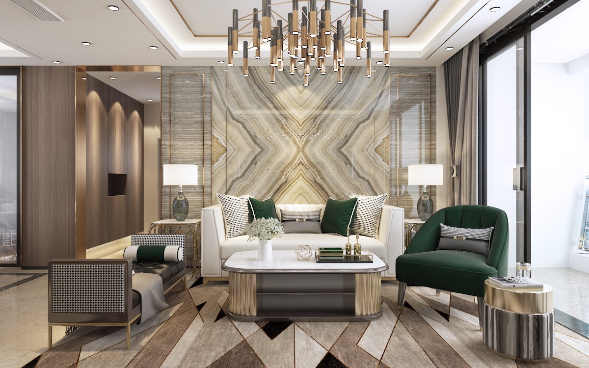 背景墙的石材与金属线条的相互结合尽显奢华。