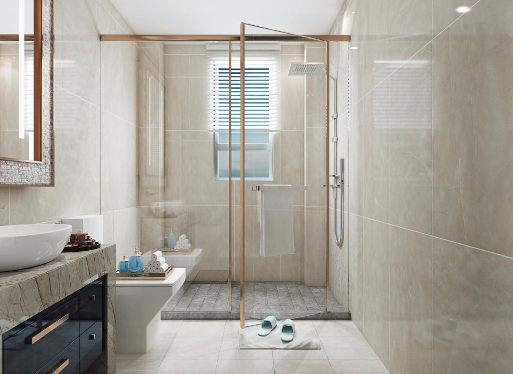 卫生间干区洗手台外移,采用面包砖铺贴至半墙,上面留白。
