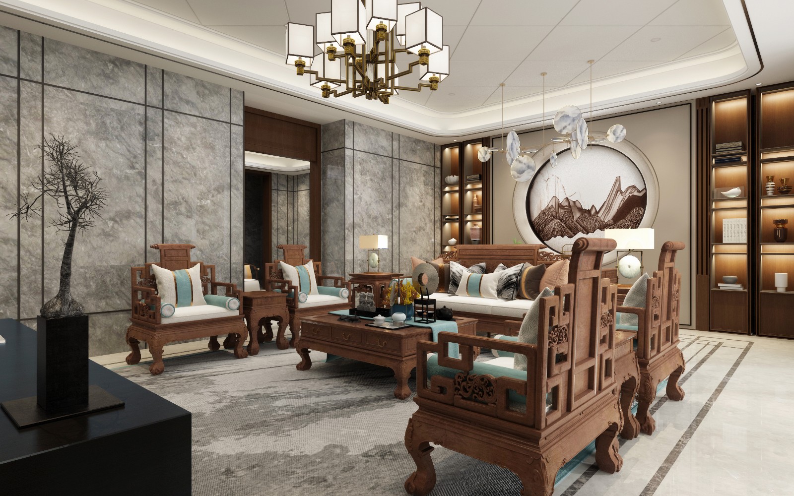 客厅中式设计,家具,背景都符合风格,墙面采用75*150大板瓷砖上墙